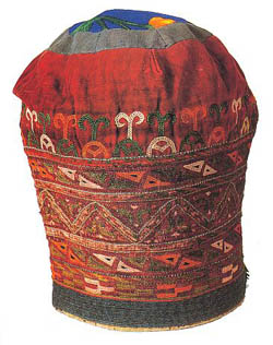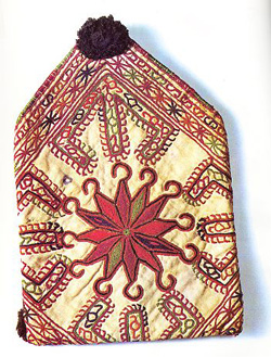 Here is another cap below, this time for a woman. It is described as Uzbek (Tashkent tradition), Mazar-i-Sharif (Balkh), 1930.