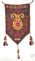Here are two items that have more familiar shapes to many of us. They are both described as “Door hanging ornament, used in yurt, Lakai Uzbek, Kunduz, 1930.” I quite like how they demonstrate that both brighter and darker palettes can be effective.