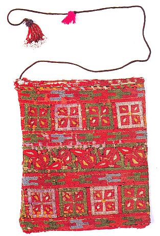 Pashtun nomad, Katawaz (Ghazni), 1960 No dimensions are provided in this book and this is the kind of piece about which this is inconvenient, since the facing page presents four bags with the same shape but describes them as “make up bags,” making me wonder if this distinction suggests that this one is larger. The item left is described as a Pashtun purse, Maydan, 1950 |